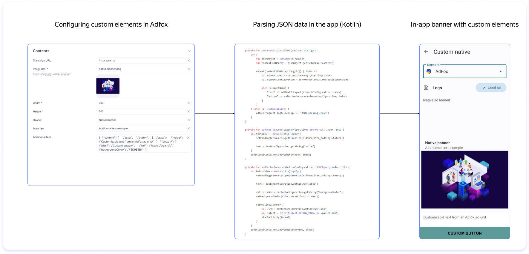 { "content": [ "text", "button" ], "text": { "value": "Customizable text from an Adfox ad unit" }, "button": { "label": "Custom button", "link": "https://ya.ru/", "backgroundColor": "#5D9B9B" } }To pass the click-through URL for JSON elements of the banner, use the macro: