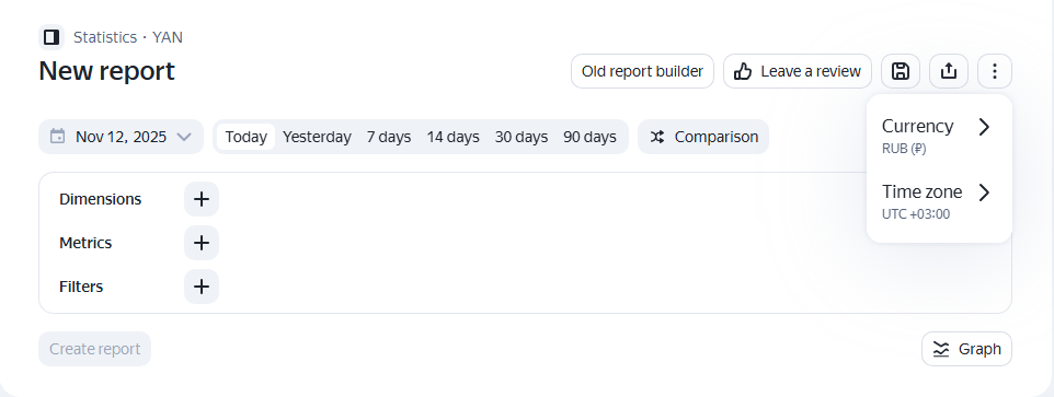 By default, the time zone matches the one set in your Yandex ID, and all financial metrics are shown in rubles. To change the time zone or currency, click and select the option you need.