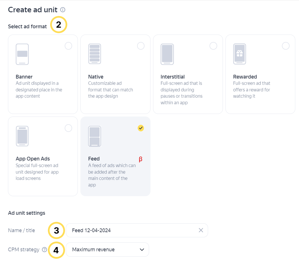 Feed의 경우 Yandex Advertising Network의 광고만 표시할 수 있습니다. 외부 광고 네트워크는 연결할 수 없습니다.