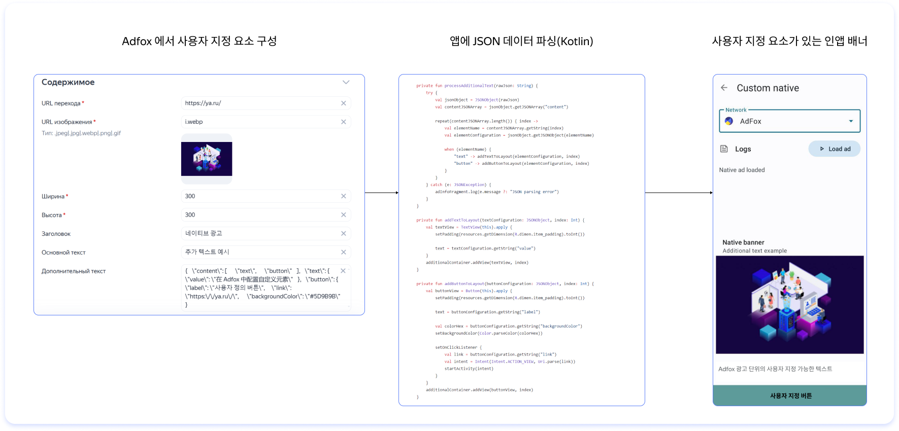 { "content": [ "text", "button" ], "text": { "value": "Customizable text from an Adfox ad unit" }, "button": { "label": "Custom button", "link": "https://ya.ru/", "backgroundColor": "#5D9B9B" } }배너의 JSON 요소에 대한 클릭 URL을 전달하려면 매트로(