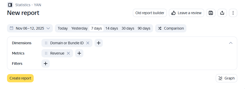 보고서를 생성하려면 Yandex Advertising Network 인터페이스 왼쪽 메뉴의 {}Statistics로 이동한 다음 {}YAN{}을(를) 선택하세요. 저장된 보고서는 My reports에 표시됩니다.