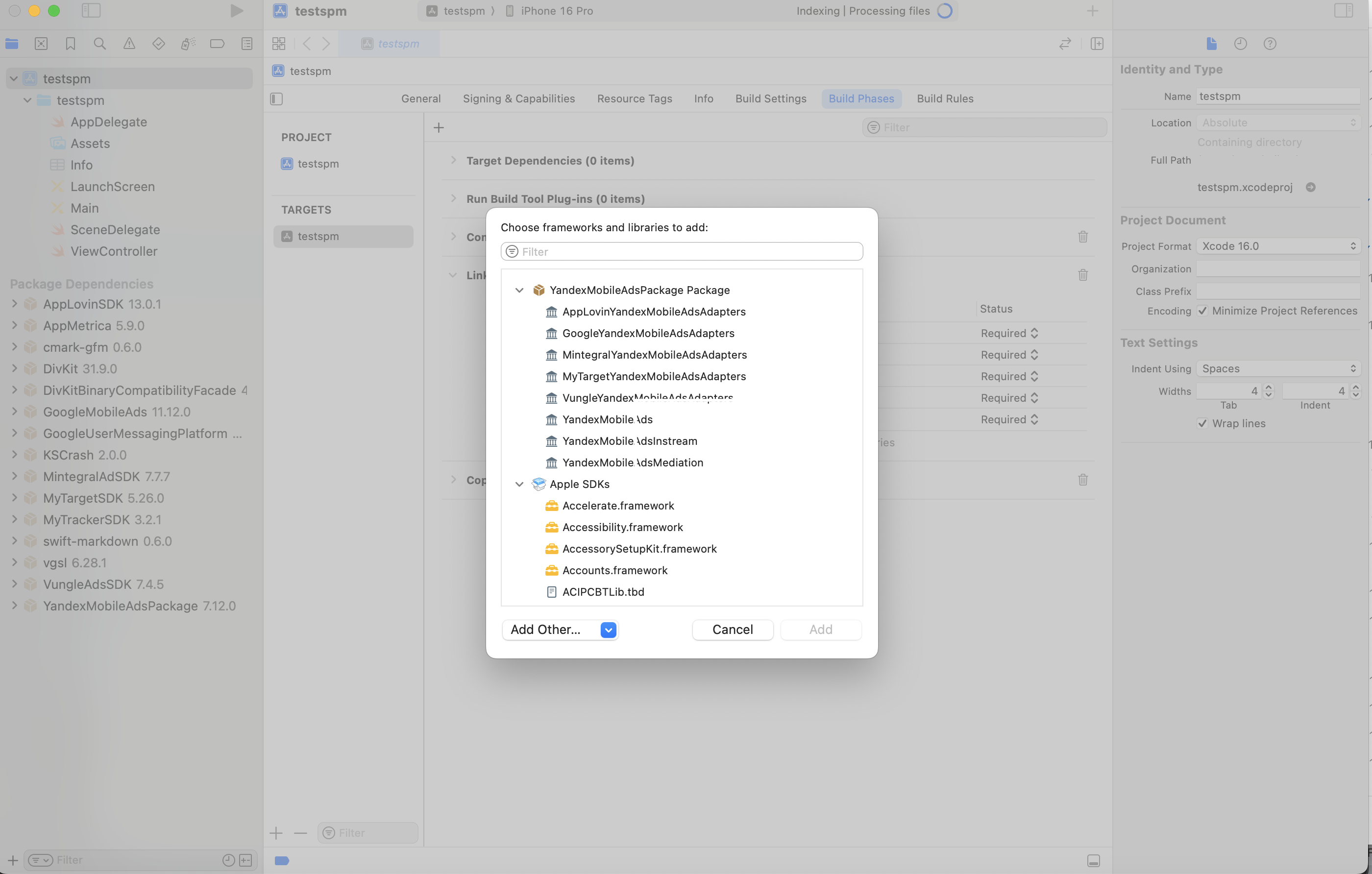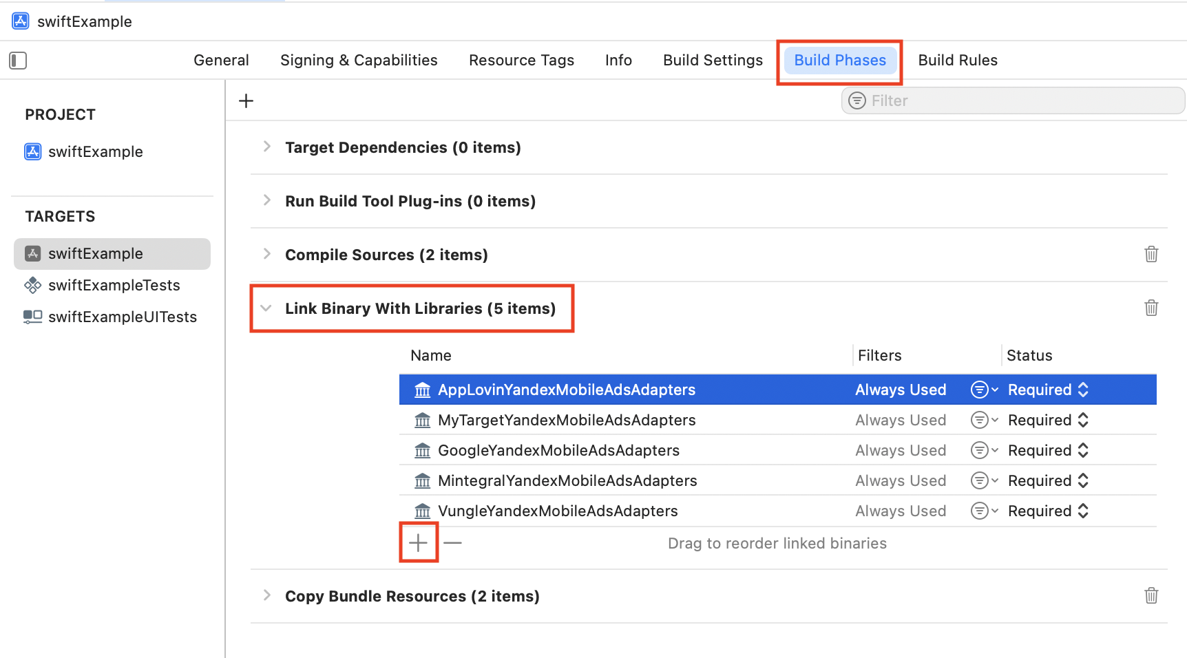 . - Проверьте, что таргет слинкован с YandexMobileAdsPackage. Если таргет не слинкован, добавьте связь с библиотекой в секции Link Binary With Libraries через значок +.