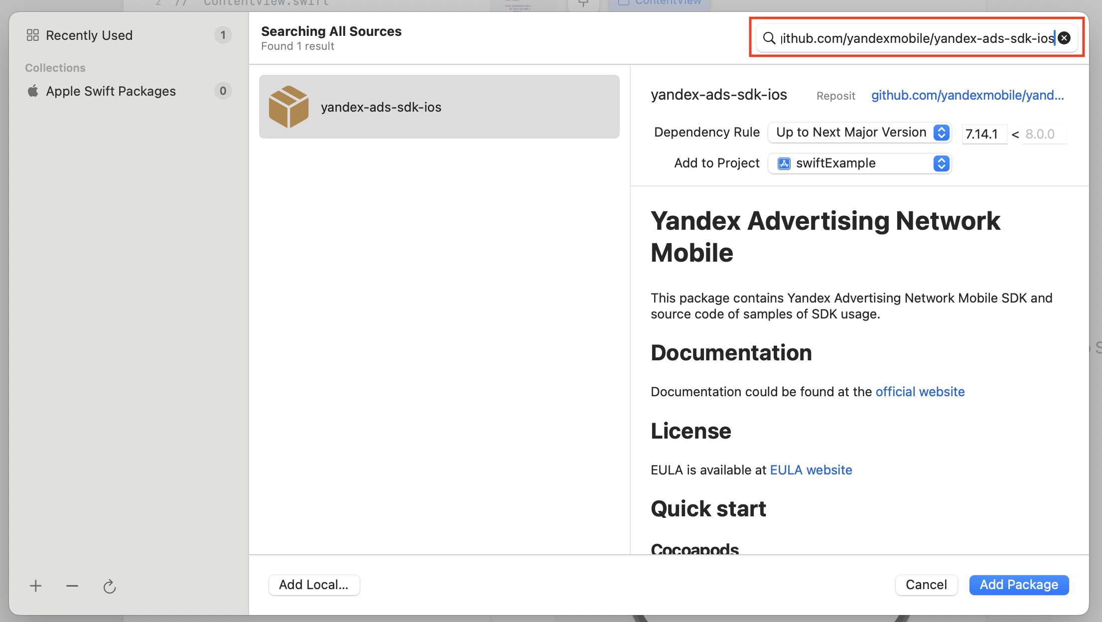 - В Xcode в своем проекте добавьте зависимость через File → Add Packages dependencies.