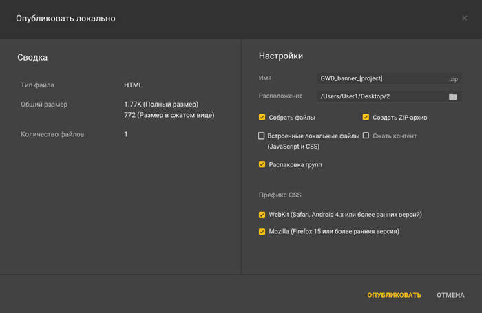 После публикации проекта заархивируйте его в формате .zip. Ваш креатив готов для загрузки в баннер Adfox.