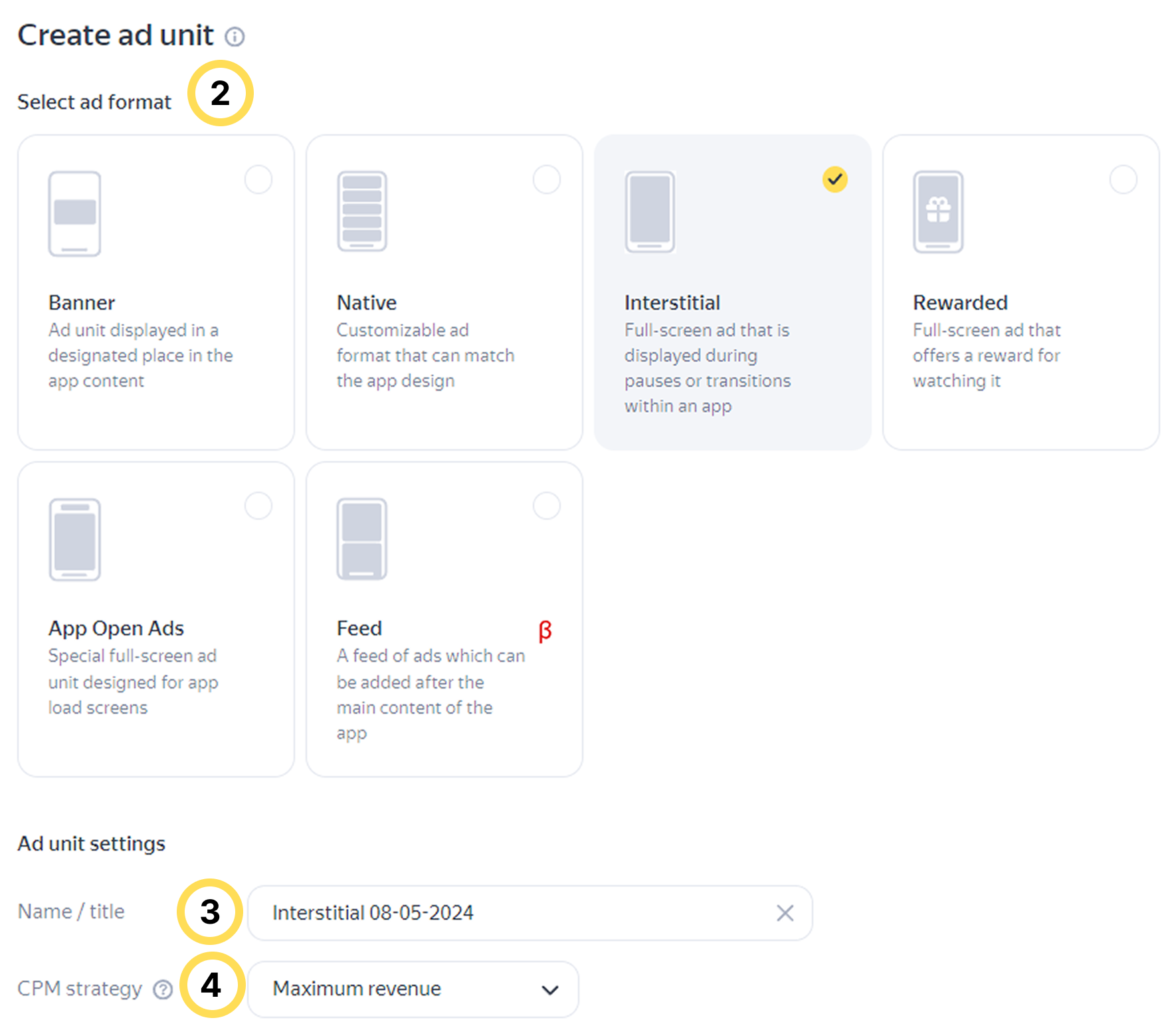 输入广告单元的名称:这样可以更轻松地在 Yandex Advertising Network 界面中查找该单元。