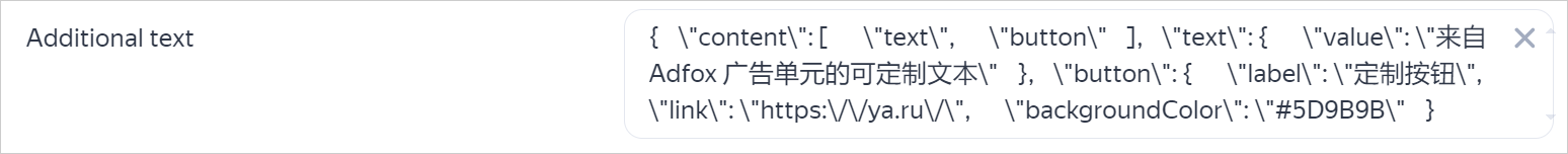 { "content": [ "text", "button" ], "text": { "value": "Customizable text from an Adfox ad unit" }, "button": { "label": "Custom button", "link": "https://ya.ru/", "backgroundColor": "#5D9B9B" } }要传递横幅广告 JSON 元素的点击跳转 URL,请使用宏:
