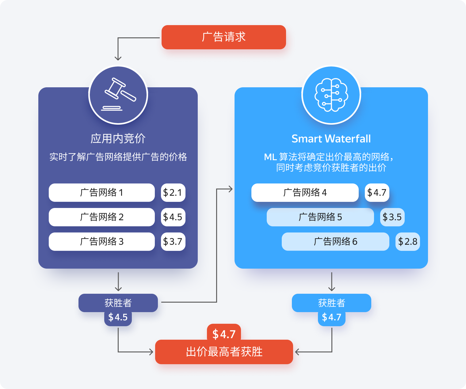 通过 智能瀑布流 对接的广告网络也会竞争展示次数。竞价网络响应后,机器学习算法会预测其他网络是否可以提供更高的竞价: